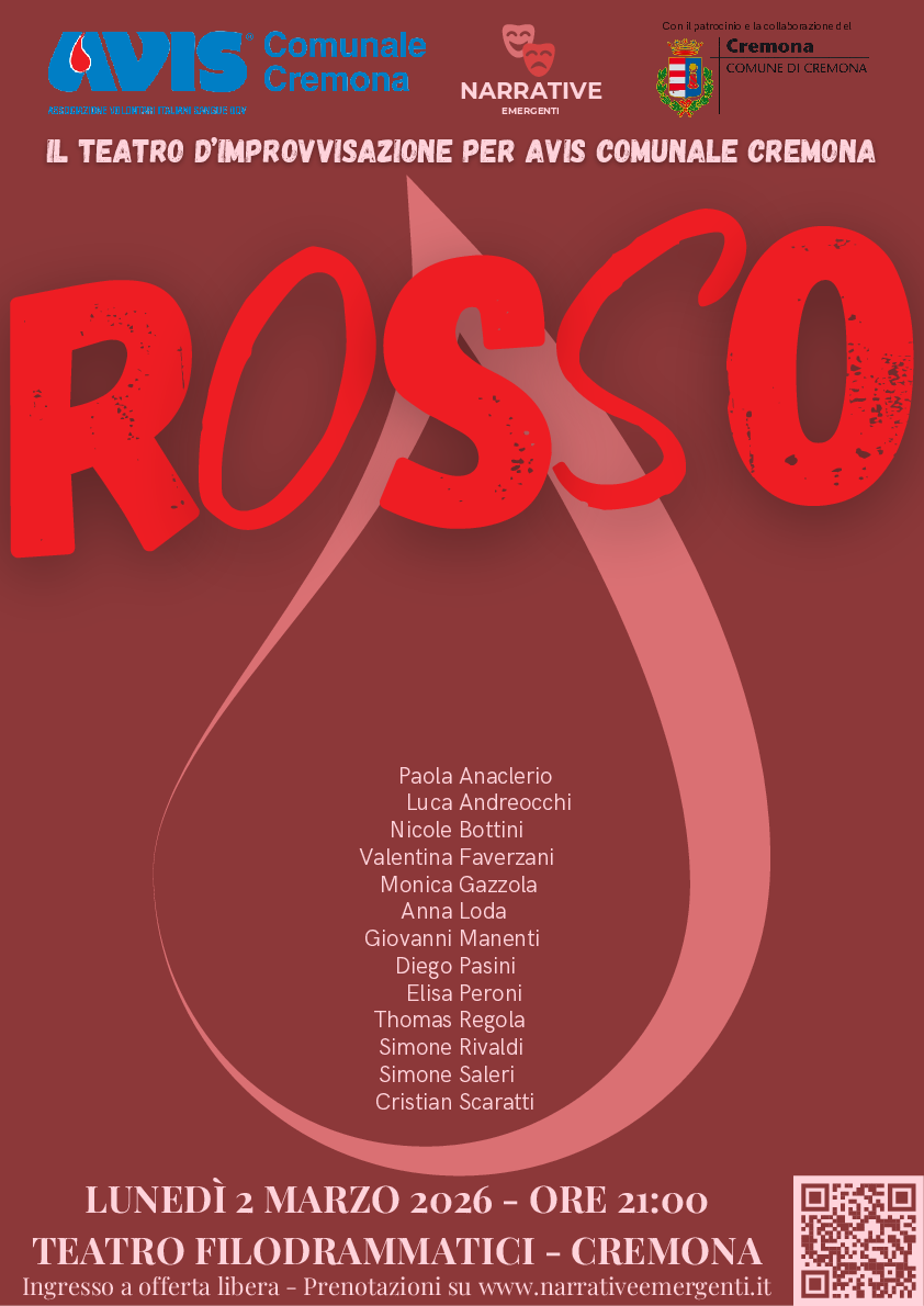 Rosso utilizza il teatro d’improvvisazione come strumento per dare voce ai bisogni del territorio. Gli attori, infatti, guidati solo dalla fantasia e dall’interazione con il pubblico, daranno vita a storie inedite e sorprendenti, dove il Dono sarà il tema centrale. Tutto il ricavato della serata sarà, infatti, devoluto a sostegno di AVIS Comunale di Cremona per aiutarli a proseguire le attività di sensibilizzazione, verso la raccolta di sangue nel territorio cremonese.